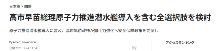 12月18日,有日本首相官邸官员公然声称,鉴于濒临所谓“严峻的安全保险环境”,日本应当领有核兵器。12月23日,高市早苗在接受采访时谈及所谓日本“是否应领有核潜艇”问题时则声称“不扬弃任何选项”。