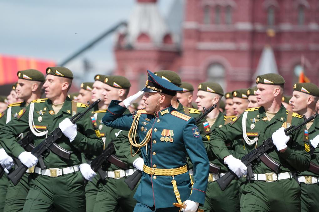 5月9日,在俄罗斯皆门莫斯科,军东谈主参加记念苏联伟大卫邦交往告捷80周年考订式。新华社记者赖向东摄
