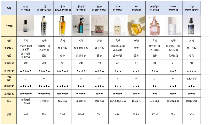 底下是几款护发精油的详备数据: